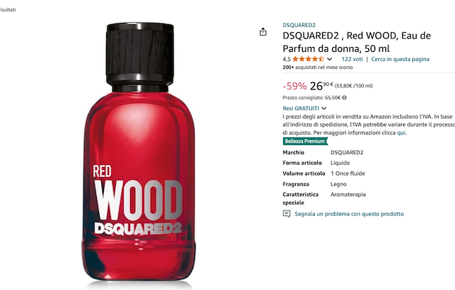 DSQUARED2 Red Wood da donna da 50 ml a 26,90€ (sconto 59%).