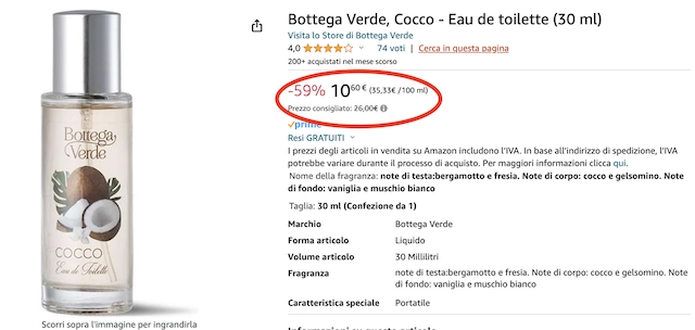 Bottega Verde al cocco profumo da 30 ml a 10,60€.