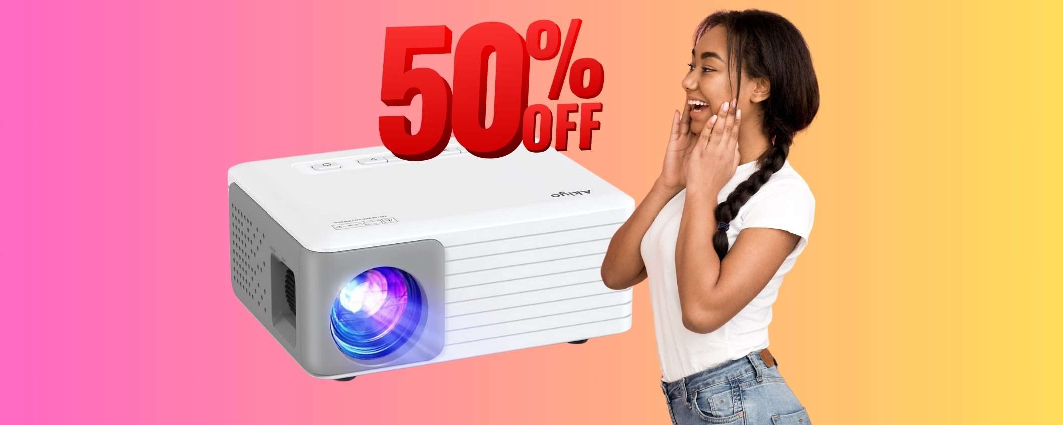Se ami vedere i film o le serie TV e ti piace il cinema, sono certo che sarai felice di scoprire questa promozione. Se vai adesso su Amazon puoi aggiungere al tuo carrello questoproiettore portatile a soli 49,99 euro, invece che 99,99 euro. Per averlo a questo prezzo applica il coupon in pagina e inserisci il codice MHBT8AKH al momento del pagamento.