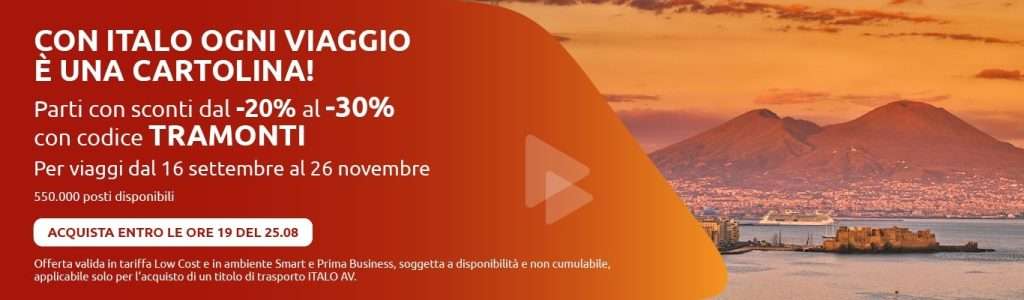 La promo TRAMONTI di Italo permette di risparmiare fino al 30% viaggiando in tariffa Low Cost negli ambienti Smart e Prima Business. Sono disponibili 550.000 posti: l’offerta è soggetta a disponibilità e non è cumulabile con altre promozioni. I biglietti scontati si applicano esclusivamente a viaggi su treni Italo AV oppure a soluzioni combinate Italo AV + Itabus, ideali per raggiungere comodamente anche le località servite dal collegamento bus.