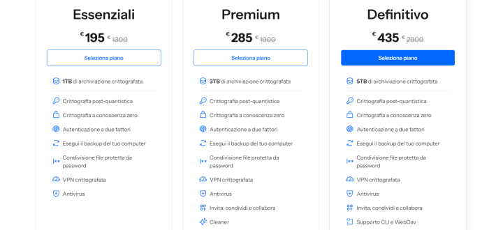 I piani disponibili sono pensati per adattarsi a diverse esigenze: da chi ha bisogno di 1 TB di archiviazione sicura fino ai professionisti che desiderano gestire fino a 5 TB di dati con strumenti avanzati di collaborazione, condivisione e backup. I prezzi partono da 195€. Tutti includono funzionalità aggiuntive come VPN crittografata, antivirus e autenticazione a due fattori, per una protezione che va oltre il semplice cloud storage.
