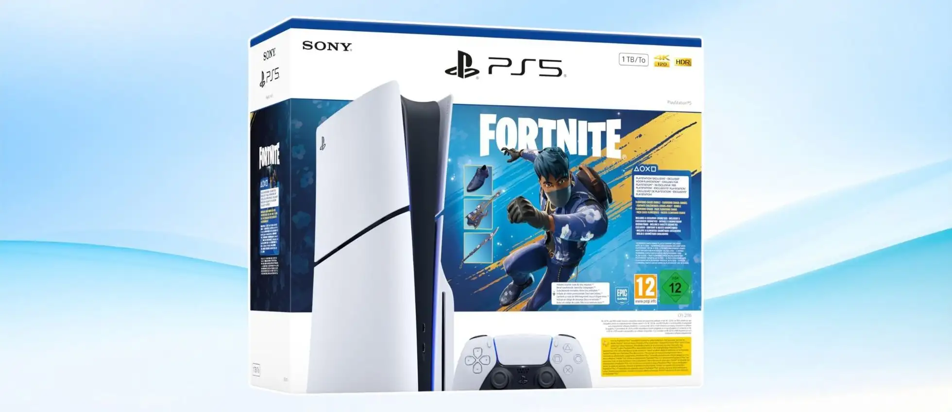 La console è dotata di una SSD da 1TB e arriva in un pacchetto che include anche il controller DualSense, un cavo HDMI, il cavo di alimentazione, il cavo USB-C e una serie di contenuti aggiuntivi per Fortnite, il popolare gioco online, che comprendono un costume (utilizzabile anche in stile LEGO), calzature, dorso decorativo, piccone, copertura, chitarra e un microfono. A ciò si aggiunge un tesoretto di 1000 V-Buck, la moneta virtuale di Fortnite, spendibile liberamente nel negozio oggetti.