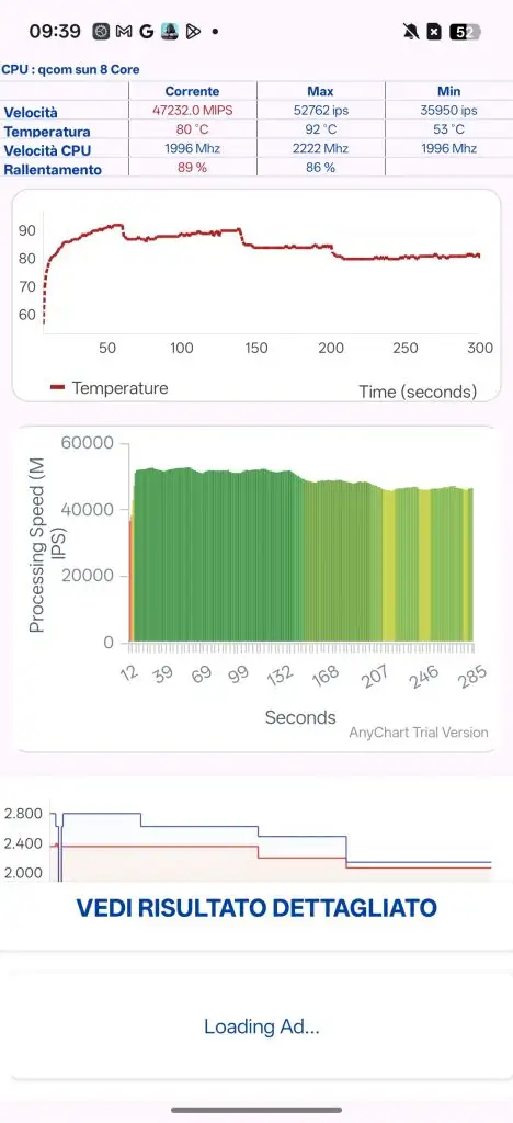 Si tratta di un processore con processo produttivo a 4 nanometri, octa-core con core ARM Cortex A720 dove quattro core lavorano a frequenze massime fino a 2,40 GHz, tre arrivano a 1,84 GHz, e uno raggiunge i 2,80 GHz. La frequenza minima invece è di 441 MHz e, nell’uso base, tutti si aggirano tra 550 e 700 MHz. La GPU integrata è la Adreno 722, che si è comportata molto bene nei test in game con titoli del calibro di Call of Duty e Fortnite. Non si sono verificati fenomeni importanti di thermal throttling, sotto carico si sono viste le frequenze abbassarsi leggermente ma mai in modo drastico a tal punto da frenare il dispositivo. La temperatura massima registrata è stata di 92°C ma nell’utilizzo base, con una temperatura esterna di 16°C, si aggirava attorno ai 35°C. A completare la dotazione hardware ci sono 512 GB di archiviazione di tipo UFS 3.1, un taglio sicuramente ben apprezzato!