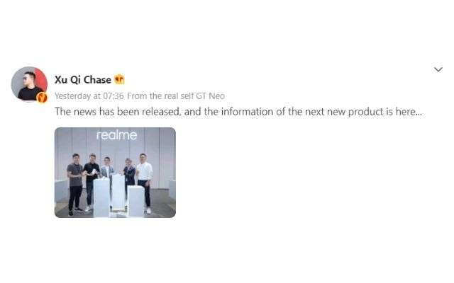 Ieri, il CMO di Realme Xu Qi si è recato su Weibo per condividere un’immagine con se stesso, Fukasawa e altri dirigenti dell’azienda al fine di per anticipare l’arrivo di una nuova Master Edition. Il post di Weibo non ha menzionato il nome del dispositivo in questione.