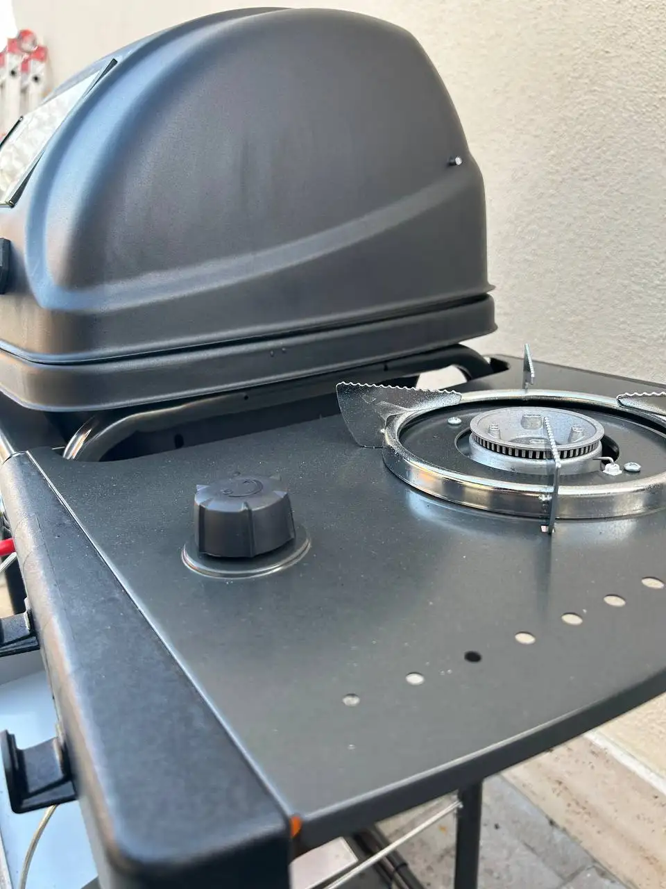 Sul lato sinistro troviamo un ripiano comodo per appoggiare vassoi o strumenti, ma richiudibile all’occorrenza. Sul lato destro, invece, è presente il fornello da 2,3kW che vi consentirà di tenere al caldo eventuali salse o condimenti con cui servire la carne.