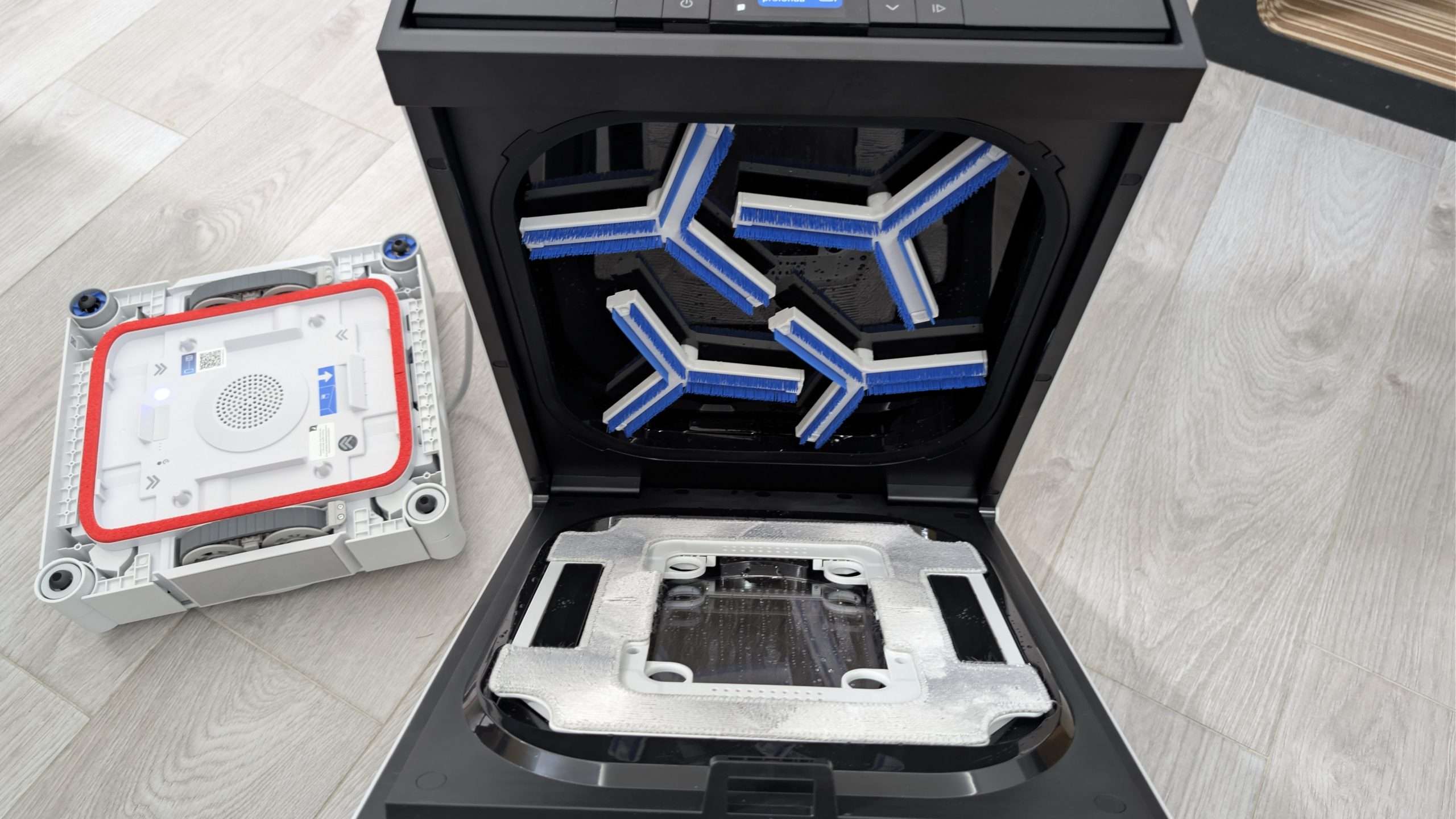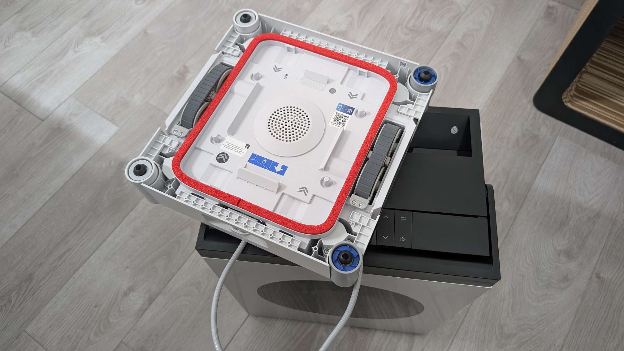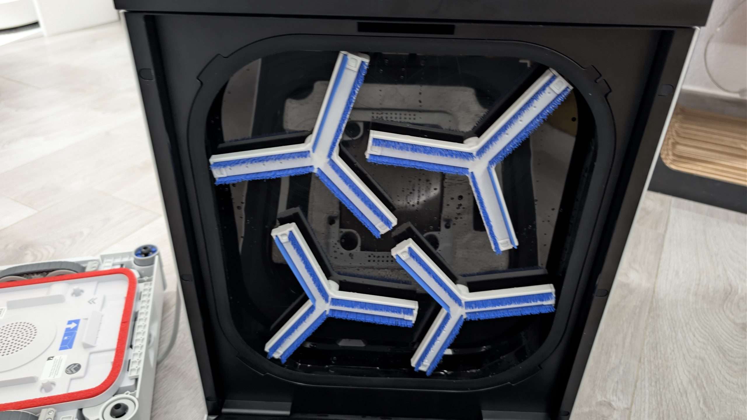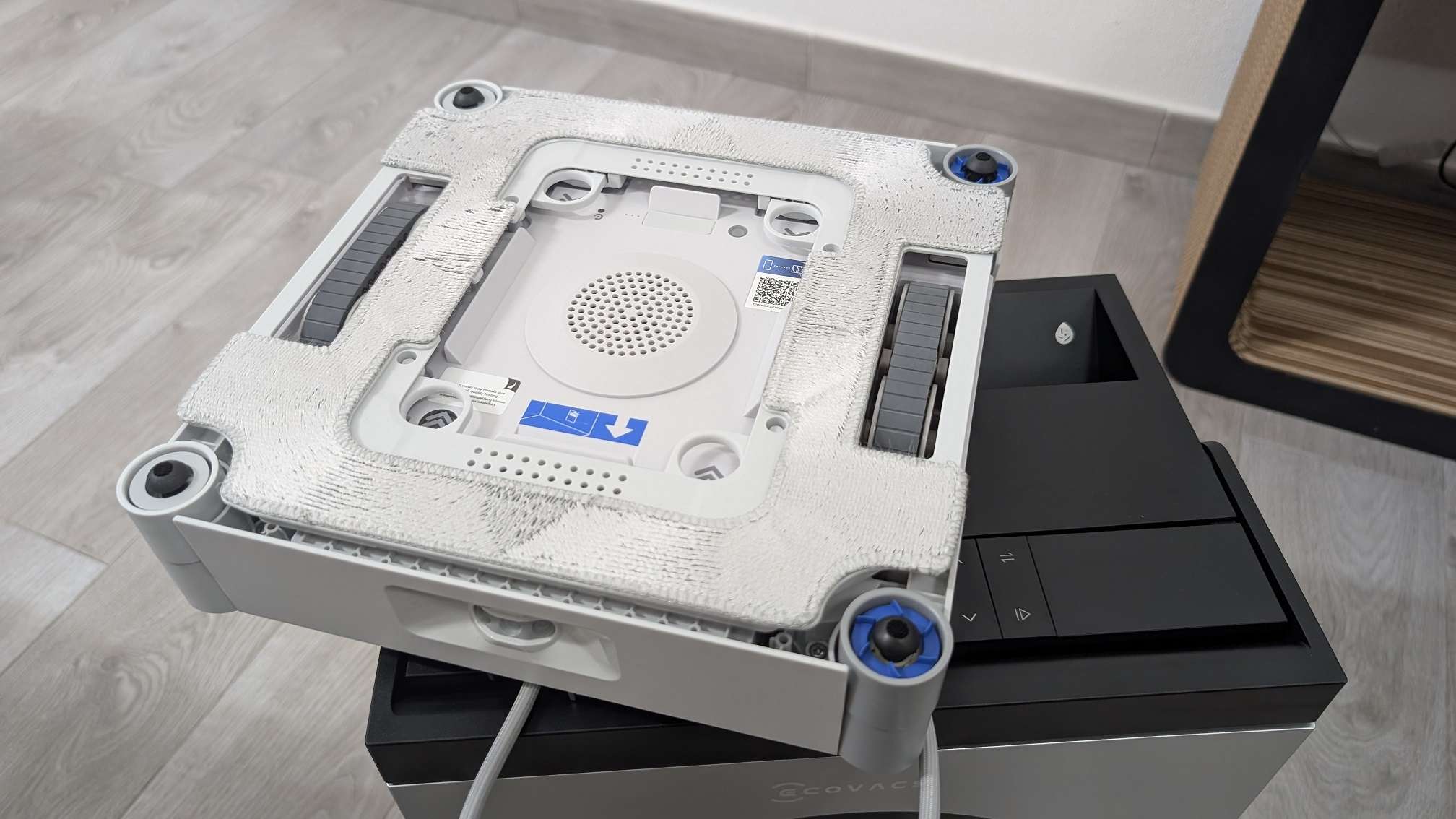 Uno degli aspetti più interessanti resta senza dubbio il sistema di preparazione e lavaggio del panno. Il panno di pulizia viene inserito nell’apposito vano della base e, prima di iniziare il lavoro, viene lavato automaticamente tramite un complesso sistema di ugelli ad alta pressione e dischi rotanti che rimuovono lo sporco in profondità, lasciandolo con il giusto grado di umidità per una pulizia efficace e senza striature. È una soluzione originale, concreta e soprattutto funzionale, che fa risparmiare tempo e rende l’esperienza molto più “hands-free”.