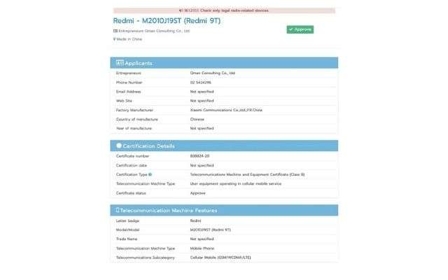 Un nuovo telefono Redmi con numero di modello M2010J19ST ha appena ricevuto la certificazione da parte dell’autorità della National Broadcasting and Telecommunications Commission (NBTC) della Thailandia. L’elenco rivela che il dispositivo approderà nel Paese come Redmi 9T. Tranquilli: non si tratta di un nuovo device ma semplicemente di una versione ribrandizzata di un telefono Redmi già esistente.