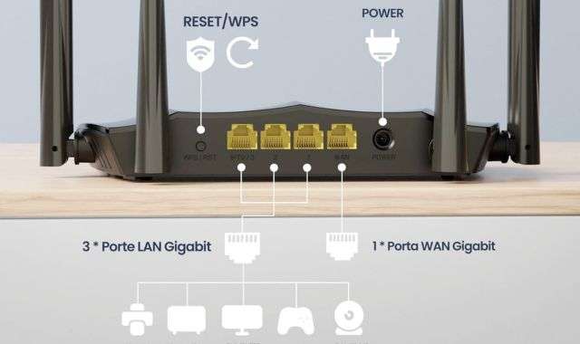 Il router è dotato di tre porte LAN e una porta WAN Gigabit (10/100/1000Mbps), che garantiscono una connessione più stabile e veloce per trasmettere e ricevere dati. Inoltre, supporta modalità flessibili, tra cui la modalità Access Point per convertire la connessione cablata in una rete wireless e la modalità Ripetitore per amplificare la copertura del segnale WiFi.