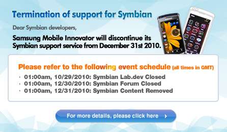 In particolare, Samsung Mobile Innovator terminerà tutte le attività di supporto agli sviluppatori il prossimo 31 dicembre 2010, ma già a partire dal 29 ottobre 2010 inizierà l'abbandono di questo sistema operativo con la chiusura del Symbian Lab.dev.