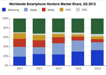 Negli ultimi due anni, Samsung ed Apple hanno raddoppiato la loro quota di mercato congiunta. La società corana mantiene il suo vantaggio su Apple grazie a 50 milioni di cellulari venduti. Apple ha fatto registrare un trimestre in leggero calo dovuto molto probabilmente ai clienti che attendono l’arrivo sul mercato della nuova versione dell'iPhone che sarà annunciata verso fine Settembre.