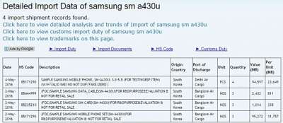 Sul sito web di Zauba, che si occupa di monitorare l’import/export indiano, è stato avvistato per la prima volta il Samsung SM-A430U (sigla che per i più sta ad indicare il Galaxy A4). Dall'inserzione che appare sul sito abbiamo notizie certe sulle dimensioni del display: 5,5 pollici.
