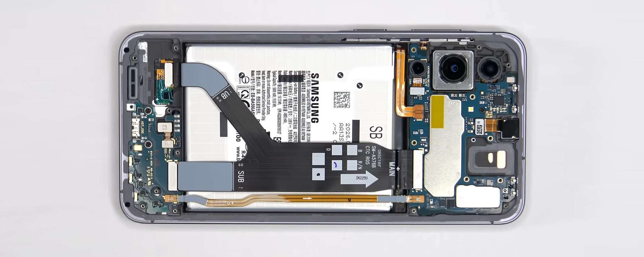 Aprire il Galaxy A57 non è particolarmente complicato: un po’ di calore per staccare il pannello posteriore, qualche vite a croce e tutto viene via abbastanza rapidamente. L’organizzazione interna è quella che ci si aspetta da uno smartphone moderno con la scheda madre nella parte superiore e la batteria che occupa buona parte dello spazio restante.