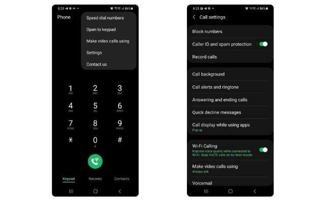 Per accedere alla funzionalità di registrazione delle chiamate di base, aprite l’app Telefono, toccate il menù a tre punti nell’angolo in alto a destra, quindi andate nelle “Impostazioni“. Dovresti vedere l’opzione “Registra chiamate” nella parte superiore della seguente interfaccia, immediatamente sotto la funzionalità di protezione dallo spam. Come nelle seguenti schermate: