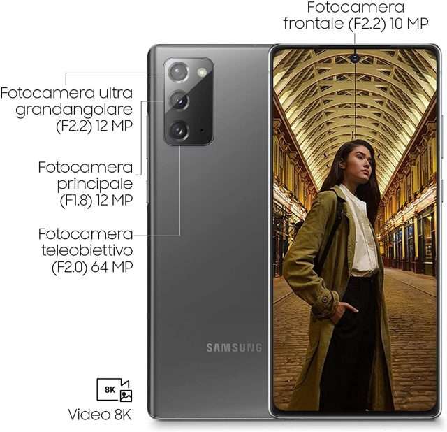 Degno di nota è il comparto fotografico che vanta tre fotocamere differenti con lente principale da 12 MP, lente grandangolare da 12 MP e teleobiettivo da 64 MP. Sono presenti lo Space Zoom e lo Zoom Ottico Ibrido. Ammontano a 10 i megapixel della fotocamera dedicata ai selfie. Grazie alla sua tecnologia, Galaxy Note20 5G registra video in 8K e sfrutta la modalità a 24 fps per catturare ogni dettaglio.
