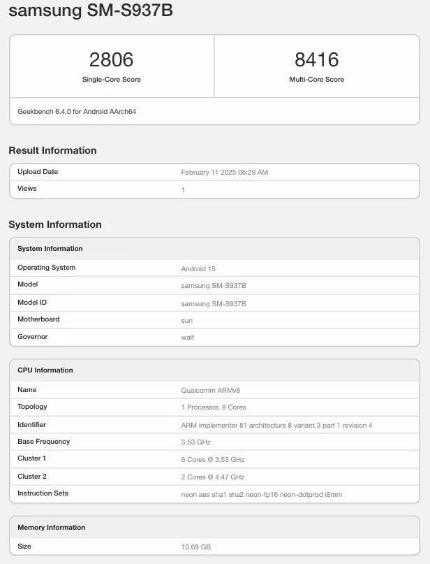 Il dispositivo ha ottenuto un punteggio di 2806 nel test single-core e 8416 in quello multi-core, dimostrando prestazioni in linea con le aspettative. Come previsto, il telefono sarà equipaggiato con Android 15, accompagnato dall’interfaccia One UI 7 di Samsung, al pari degli altri modelli della serie S25.