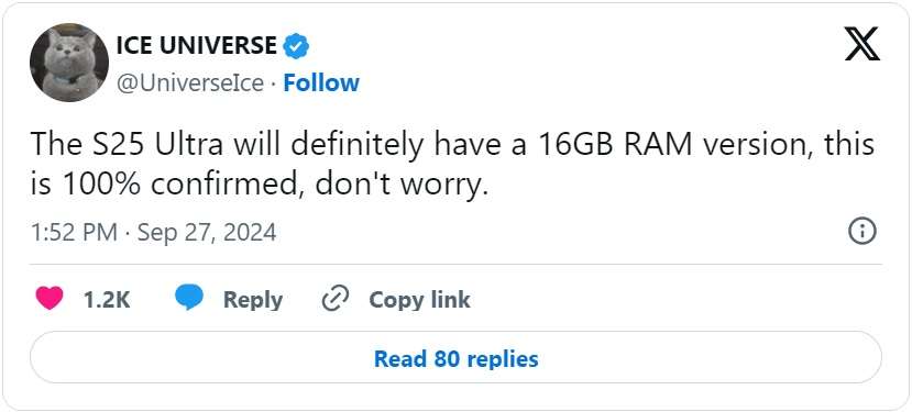 Il famoso leaker ne è più che convinto: Samsung Galaxy S25 Ultra “avrà sicuramente una versione con 16 GB di RAM“. Ice Universe ha poi precisato come questa anticipazione sia da ritenere “confermata al 100%“, il che alimenta le aspettative dei potenziali consumatori nei confronti del prossimo flagship di casa Samsung.