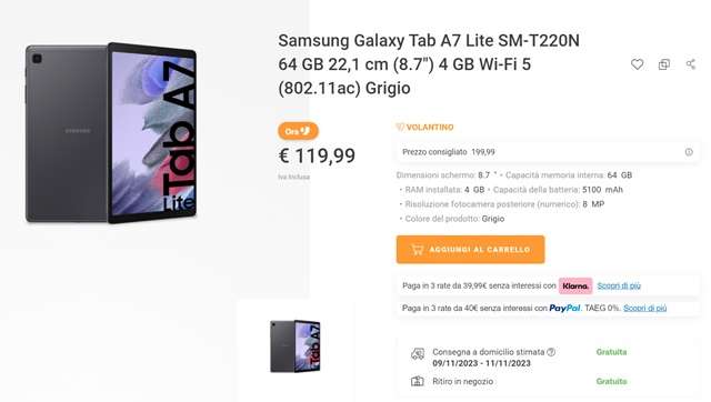 Tra le offerte del volantino di Unieuro Novembre Ti Sorprende vi segnaliamo quella del Samsung Galaxy Tab A7 Lite, in vendita a 119,99 euro invece di 199,99 euro (prezzo consigliato al pubblico). Il dispositivo può essere acquistato anche in 3 rate a interessi zero da 40 euro al mese con Klarna o PayPal. Inoltre, gli utenti che acquisteranno il tablet Samsung sul sito unieuro.it godranno delle spese di spedizione gratuite.