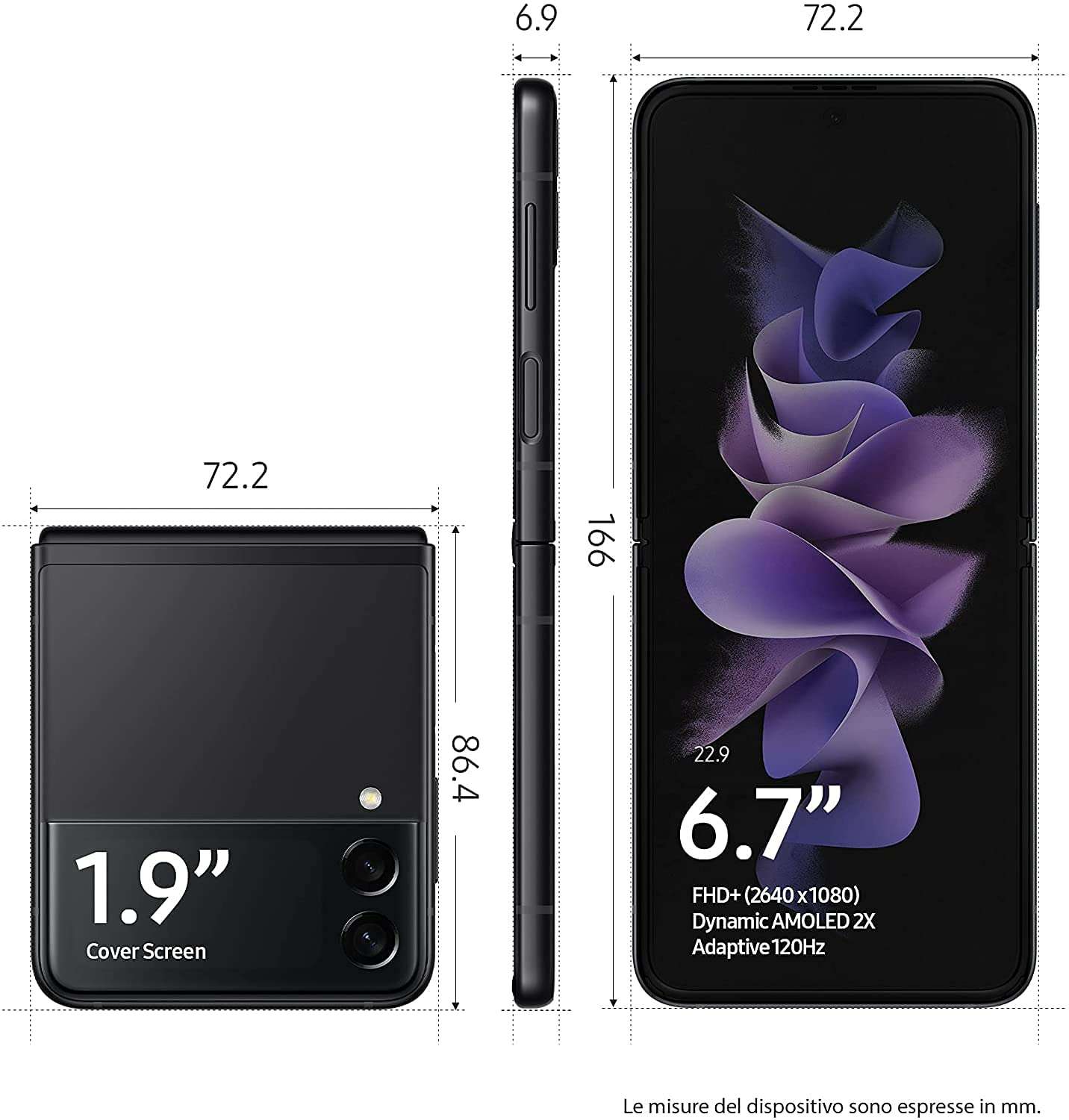 Leggi messaggi, scatta foto, riproduci musica e molto altro ancora senza aprire il telefono: il display posteriore da 1,9 pollici ti mostrerà ogni notifica ed informazione. Al suo interno, Samsung Galaxy Z Flip3 5G rende disponibile uno schermo Dynamic AMOLED 2X con diagonale da 6,7 pollici, risoluzione FullHD+ e frequenza d’aggiornamento pari a 120Hz.