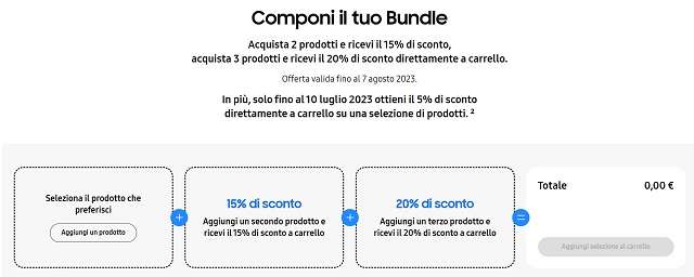 Ora aggiungi un secondo prodotto per ricevere il 15% di sconto a carrello. Volendo, puoi scegliere anche un terzo articolo tra quelli disponibili per beneficiare di uno sconto del 20%. Componi il bundle che più ti interessa e pagalo fino al 20% in meno grazie all’ultima iniziativa di Samsung.