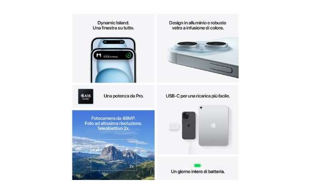 Il nuovo Apple iPhone 15 128GB risponde perfettamente alle tue esigenze. Il processore A16 Bionic è ancora più potente, garantendo prestazioni eccellenti ed elevate anche sotto stress. Il display Super Retina XDR da 6,1 pollici è ormai un vero e proprio must se vuoi immagini super colorate e ricche di dettagli. Inoltre, con questo modello Dynamic Island non è disponibile solo dalla versione Pro. Goditi anche tu questa tecnologia perfetta che migliora notevolmente l’usabilità di questo telefono. La doppia fotocamera assicura scatti da vero professionista anche al buio.