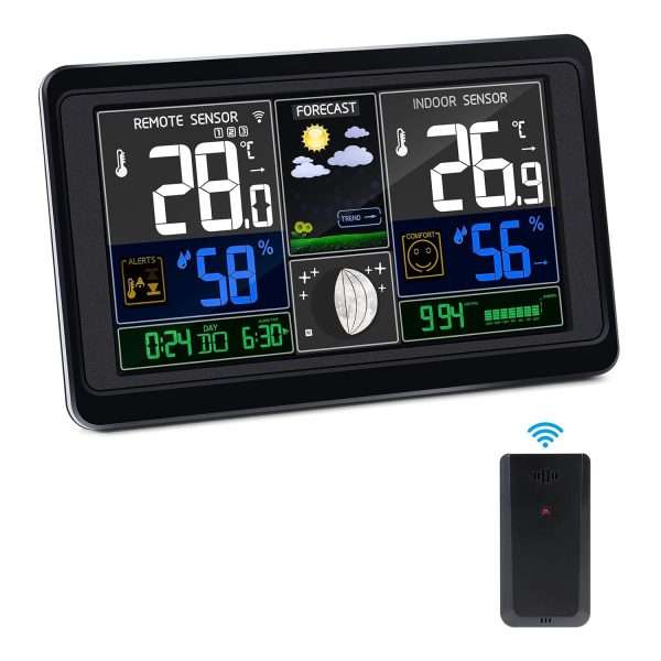 Dotata di una vasta gamma di funzionalità, ti offre informazioni dettagliate sul tempo, il tutto in un unico dispositivo compatto. Grazie al sensore wireless per interni ed esterni, ti fornisce letture precise della temperatura sia all’interno che all’esterno. Potrai controllare le variazioni di temperatura e prendere le giuste precauzioni per il comfort nella tua casa o nel tuo giardino. Inoltre, il monitor di umidità ti consente di monitorare l’umidità relativa, fornendoti informazioni utili per prendere decisioni riguardo all’irrigazione delle piante o all’uso del deumidificatore.