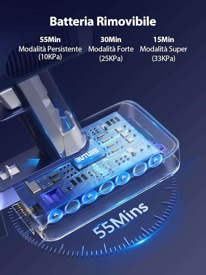 La batteria a 7 celle da 2200 mAh, ti permetterà di pulire una superficie di 200 metri quadrati per 55 minuti di seguito (20 minuti ad alta potenza, 55 minuti a bassa potenza).