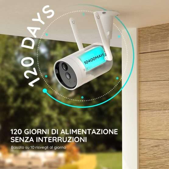 La comodità di questa telecamera WiFi è che ha praticamente tutto al suo interno e non ti fa mancare niente sotto mano. Non solo questo ma grazie all’assenza di fili la puoi installare in due secondi senza dover chiamare un tecnico. Al suo interno ha una batteria integrata che ti garantisce 120 giorni di utilizzo ininterrotti.