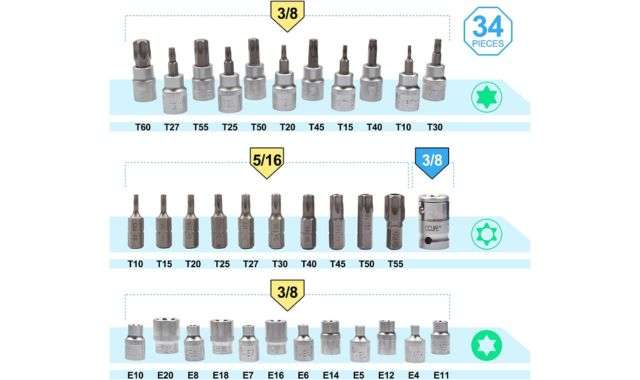 Nel dettaglio, avrai 12 chiavi a bussola esterne per azionamento da 3/8′ (misure E4 a E20) e 11 chiavi a bussola interne per azionamento da 3/8′ (misure T10 a T60) insieme a 10 inserti per chiavi a bussola interne con azionamento da 5/16′ (T10 a T55).
