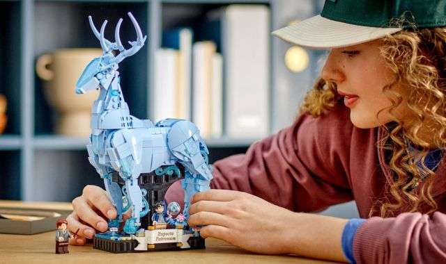 Il cervo Patronus, con zampe mobili e dettagli traslucidi azzurri per un aspetto spettrale, è esposto su un elegante supporto decorato. Inoltre, offre spazio per la minifigure di Harry Potter, completa di bacchetta magica. Un’aggiunta magica a qualsiasi collezione di gadget del mondo di Harry Potter.