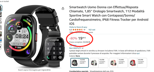 Smartwatch con ampio display e moltissime funzioni a 19,99€ (sconto 80%).