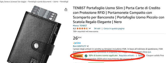 Si parte da 13€ circa soltanto, ma ricorda: per ottenere lo sconto del 50%, devi attivare il coupon sulla pagina, proprio come mostrato nell’immagine seguente.