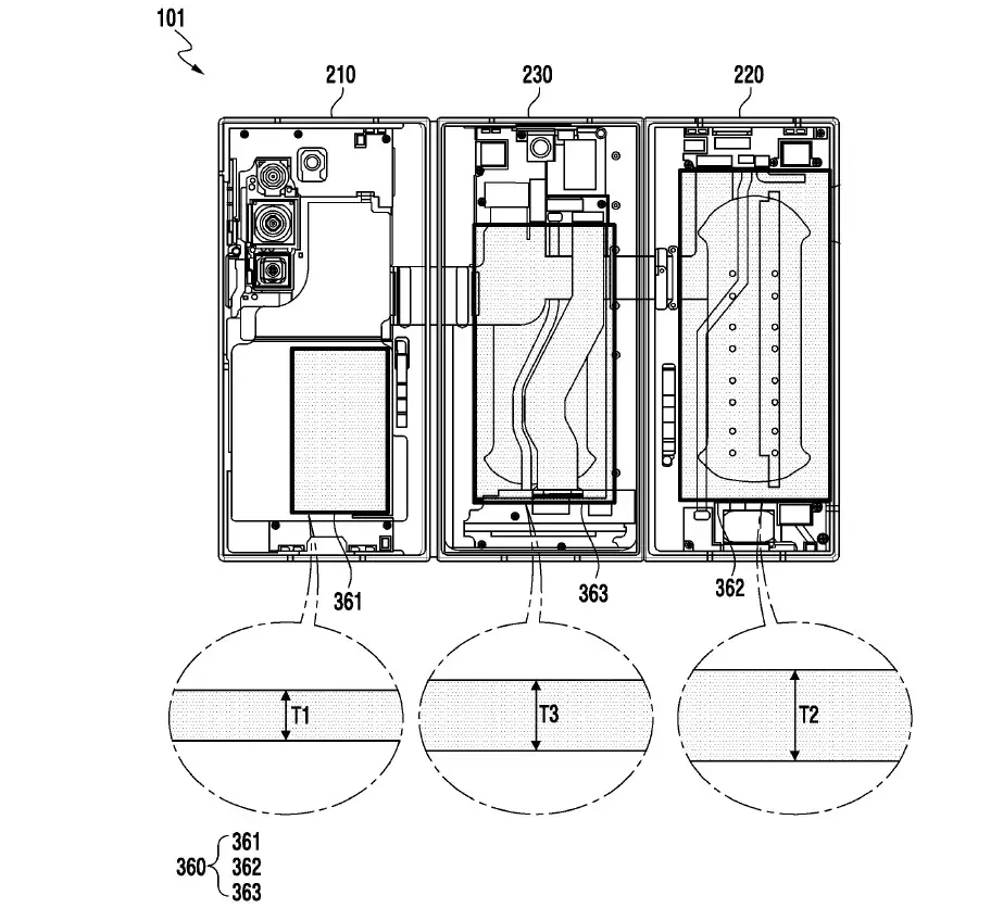 Esteticamente, il device di Samsung ricorda Galaxy Z Fold 7, ma la vera rivoluzione si nasconde all’interno. I disegni contenuti nel recente brevetto mostrano tre batterie separate, una per ciascun pannello, collegate da cavi flessibili. Tale soluzione permette di distribuire meglio il peso e sfruttare ogni millimetro di spazio disponibile.