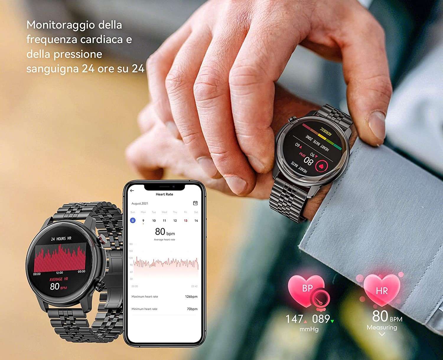 Sono davvero tantissime le funzioni di cui beneficerai grazie a questo incredibile smartwatch. Il sensore ottico integrato monitora automaticamente la frequenza cardiaca in tempo reale, ma potrai anche rilevare manualmente la pressione sanguigna e valutare la qualità del tuo riposo notturno. Presenti 8 modalità sportive che saranno certamente apprezzate dagli atleti: camminata, corsa, ciclismo, basket, nuoto e molto altro ancora. Non manca ovviamente la gestione delle chiamate, dei messaggi e delle notifiche ricevute sul tuo smartphone Android o iOS, a cui potrai abbinare l’orologio sfruttando la connettività Bluetooth.