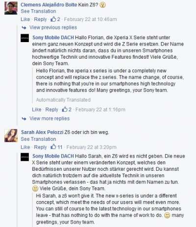 Come è possibile vedere dallo screenshot in alto (in lingua tedesca con traduzione in inglese), rispondendo ad un utente che ha chiesto informazioni in merito al prossimo Xperia Z6, Sony ha dichiarato che non verranno più rilasciati dispositivi appartenenti alla gamma Xperia Z, in quanto sostituiti dai nuovi Xperia X.