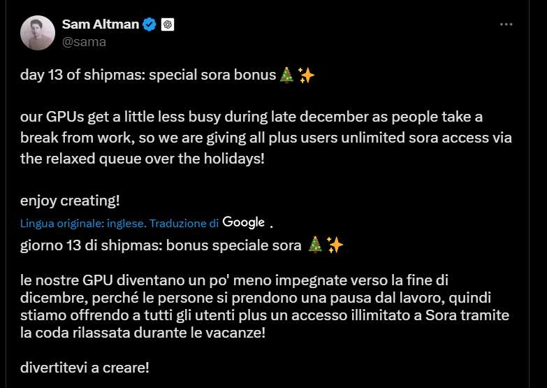 Sora è stato reso disponibile al pubblico nelle scorse settimane e già si sta rivelando un enorme successo, grazie alla sua facilità d’uso e alla capacità di trasformare rapidamente qualsiasi prompt in video. Sam Altman, CEO di OpenAI, ha annunciato il regalo per i suoi abbonati tramite un post pubblicato su X in cui afferma che “le nostre GPU diventano un po’ meno occupate a fine dicembre, perché le persone si prendono una pausa dal lavoro”.