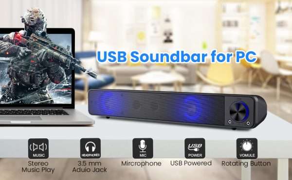 Questa eccezionale soundbar compatta, con collegamento a cavo, è perfetta per PC, piccole TV, smartphone, tablet e non solo. Potente nel suono, è dotata di illuminazione LED e anche di due ingressi anteriori per collegare – qualora lo volessi – microfono e cuffie.