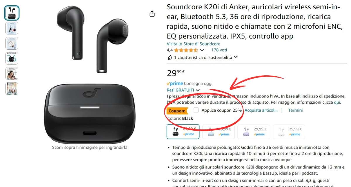Fai alla svelta perché difficilmente un’offerta del genere può durare a lungo. Quindi vai immediatamente su Amazon e acquista i tuoiSoundcore K20i a soli 22,49 euro, invece che 29,99 euro. Per averli a questo prezzo applica il coupon che vedi in pagina. Se completi l’ordine adesso li riceverai a casa tua già domani senza costi aggiuntivi, grazie ai servizi Prime. Se non sei ancora abbonato fallo ora cliccando qui.