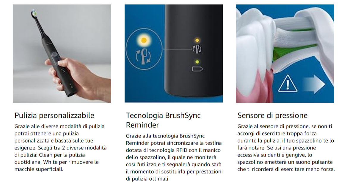 Questo spazzolino è dotato della tecnologia sonica che muove la testina fino 62.000 movimenti al minuto. In questo modo, non solo riesce ad arrivare nelle zone più difficili, ma pulisce anche in profondità. Nonostante questo movimento veloce non danneggia le gengive. E poi ha un sensore della pressione che ti aiuta a non esagerare con la forza e un timer di due minuti a intervalli di 30 secondi per una corretta igiene dentale.
