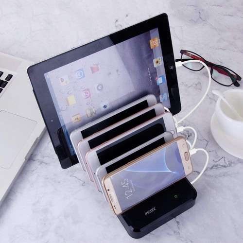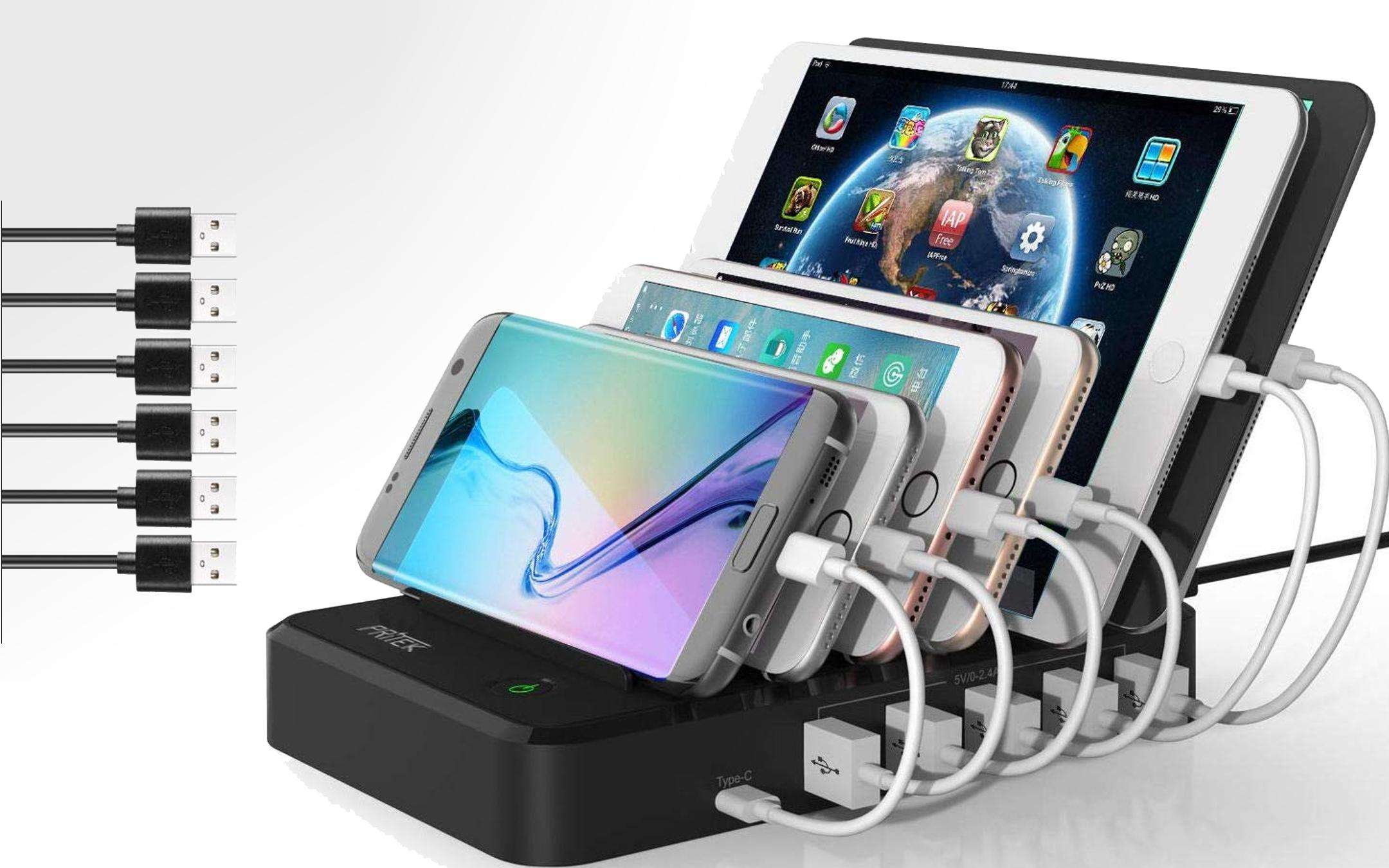 Grazie ad una stazione di ricarica espressamente studiata, è possibile mettere in carica tutti i dispositivi in un posto solo, attaccati ad una sola presa di corrente, in modo ordinato e senza la necessità di fare il giro delle stanze per recuperare tutti i dispositivi. Su Amazon è ad esempio disponibile una soluzione Pritek (26,34 euro grazie ad uno sconto del 18%) che consente di ottenere una configurazione fino a sei differenti dispositivi, così come dall’immagine seguente: