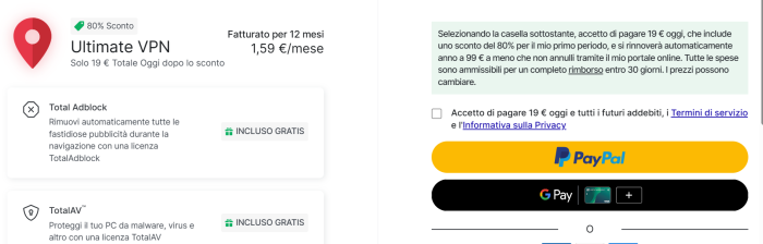 Ribadiamo la promozione del momento: TotalAV è in sconto dell’80% a 19€ per un anno, con garanzia di rimborso entro 30 giorni dall’acquisto. Per maggiori informazioni basta andare sul sito ufficiale.