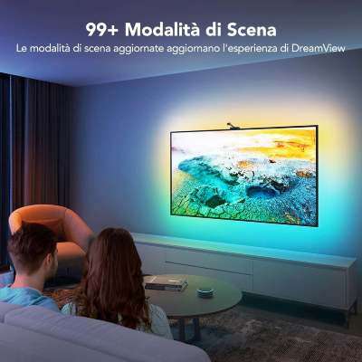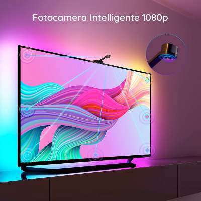 Questa striscia LED WiFI per TV ha una lunghezza di 3.8 metri ed è perfetta per TV e monitor PC da 55 a 65 pollici. Con la fotocamera a 1080p inclusa nella confezione, il sistema è in grado di riconoscere automaticamente i colori sullo schermo della TV e applicarli così alla striscia.