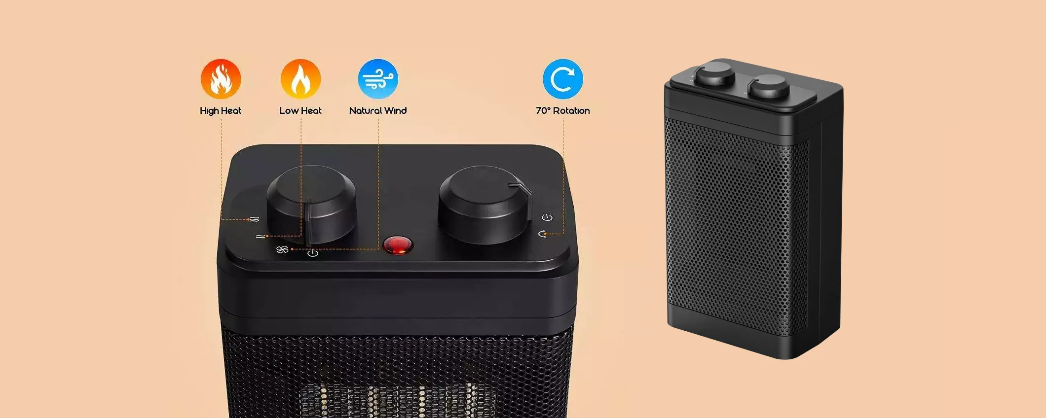 Questa eccellente stufa elettrica è dotata di elementi riscaldanti in ceramica PTC, capaci di fornire un riscaldamento pressoché immediato: ancora più calore e meno consumo energetico rispetto ai più tradizionali apparecchi. Un riscaldatore portatile con oscillazione diffusa di 70°, ideale per l’utilizzo in ambienti più grandi. Con il termostato regolabile, il mini riscaldatore monitora autonomamente la temperatura dell’aria circostante per generare un calore ottimale. La ventola della stufa elettrica Whatook offre 2 livelli di riscaldamento (1500/1000 W) ed una modalità solo ventola dell’aria fresca: piacevole calore d’inverno e refrigerio nelle giornate d’estate.