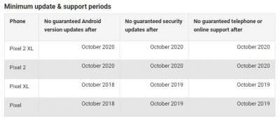 Curiosamente, Google non ha pubblicizzato questo suo importante servizio, che si può trovare solo spulciando accuratamente lo "spec sheet" e le pagine del supporto dei nuovi Pixel. Nella tabella in alto sono specificati gli aggiornamenti garantiti da Google fino al 2020 per i due nuovi smartphone e per i vecchi Pixel: