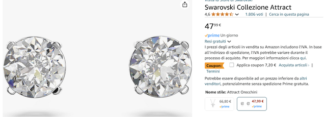 I gioielli Swarovski sono un più bello dell’altro. Prodotti preziosi e di qualità super premium, che ora sono in sconto su Amazon a prezzo da outlet. Orecchini, collane e bracciali a partire da 45€ circa appena. In alcuni casi, e solo per ogni (10 luglio), puoi aumentare ancora di più il tuo risparmio attivando direttamente in pagina uno sconto ulteriore tramite coupon, come mostrato nella seguente immagine d’esempio.