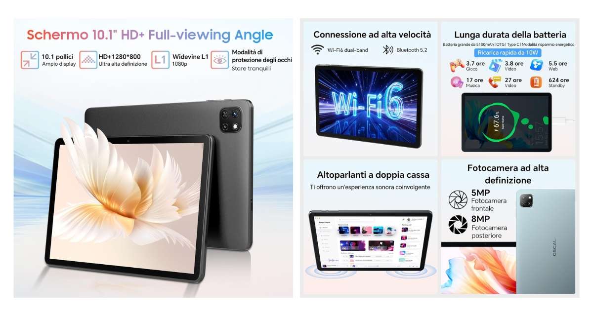 Il rapporto qualità prezzo di questo tablet Android da 10 pollici è veramente incredibile, difficile trovare di meglio. Potrai guardare video, giocare e usare le tantissime app scaricabili nell’ottimo display HD con risoluzione 1280 x 800. Ha un pannello IPS che ti permette di avere un’ottima visione e una cornice sottile. È dotato di doppi altoparlanti per un audio eccellente, una fotocamera posteriore da 8 MP e una fotocamera frontale da 5 MP.