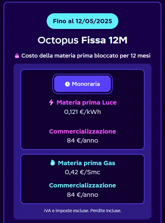 Vuoi dire addio all’ansia delle bollette che aumentano senza preavviso? Con le offerte di Octopus Energy puoi fissare il costo della materia prima luce e gas per 12 mesi e affrontare l’anno con maggiore tranquillità. Bloccare il prezzo significa proteggersi dalle oscillazioni del mercato e avere finalmente un controllo reale sulle spese domestiche.