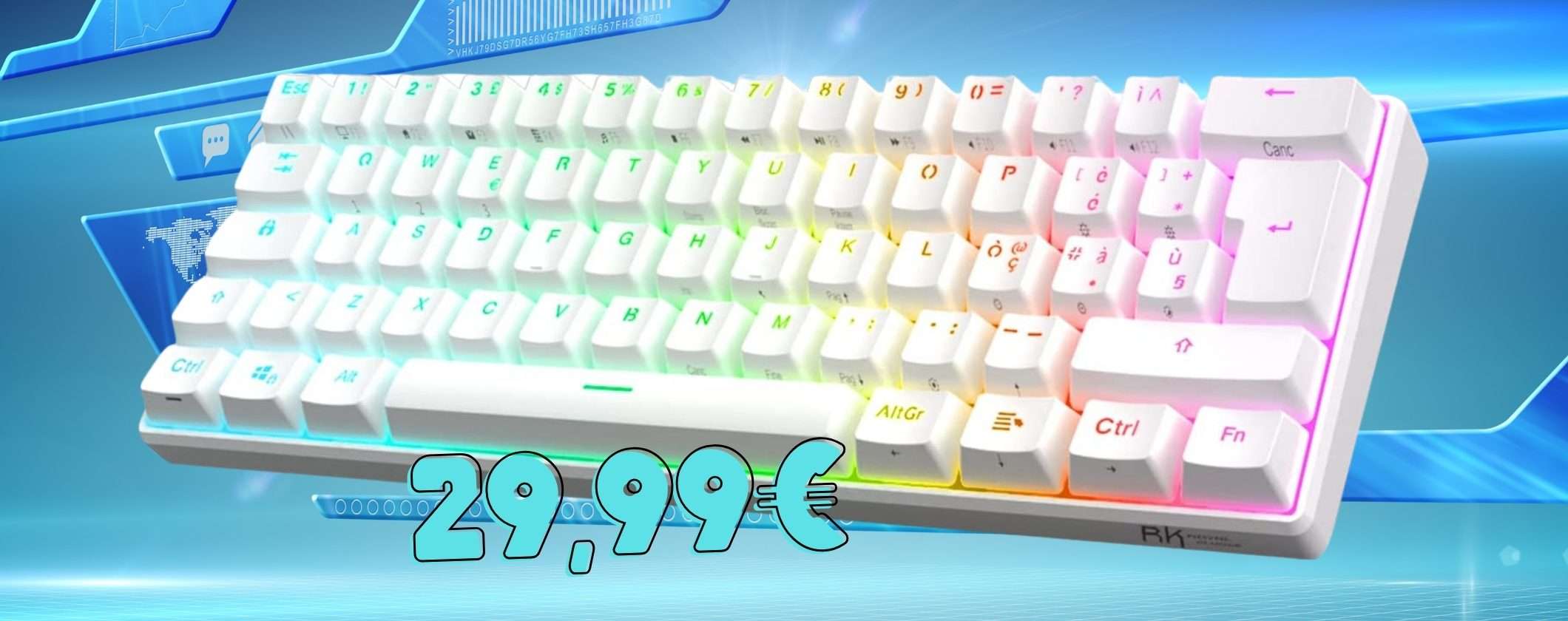 Se sei un amante dei videogiochi e quindi stai cercando di acquistare una tastiera precisa e dalle dimensioni esigue senza dover spendere un capitale approfitta di questa promozione. Se vai subito su Amazon puoi mettere nel tuo carrello la tastiera da gaming RK61 a soli 29,99 euro, anziché 53,99 euro.