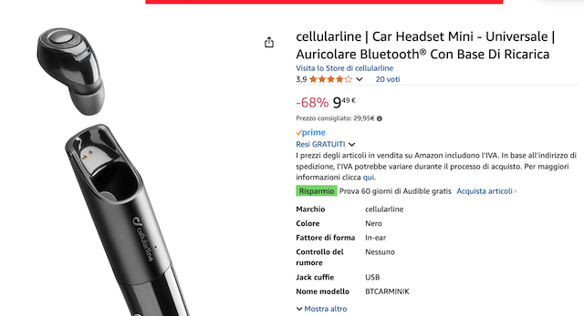 Auricolare Bluetooth singolo di Cellularline, con connettore per presa accendisigari a 9,49€.