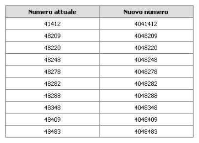 Nella tabella che segue sono riportati i numeri che saranno oggetto della variazione con indicazione del corrispondente nuovo numero di accesso: