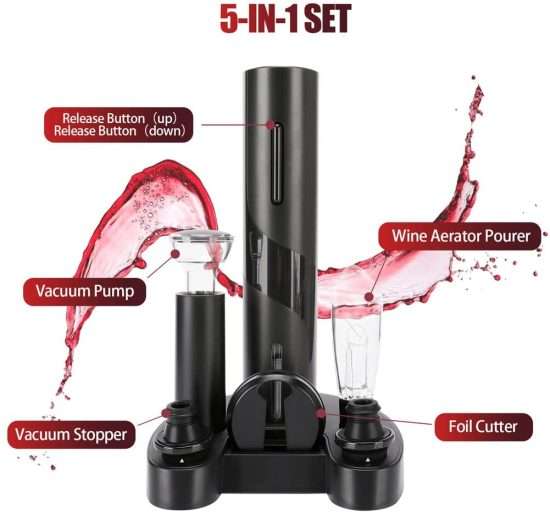 Come vedi, c’è tutto quello che può servire dal momento dello stappo fino alla conservazione di una bottiglia di vino non finita. Solitamente, il solo apribottiglie elettrico ha un prezzo parecchio più elevato. Per questo motivo, adesso che ho notato lo sconto, non ho potuto fare a meno di segnalarti questo kit 5 in 1 – perfetto per gli amanti del vino – a prezzo ridicolo su Amazon.